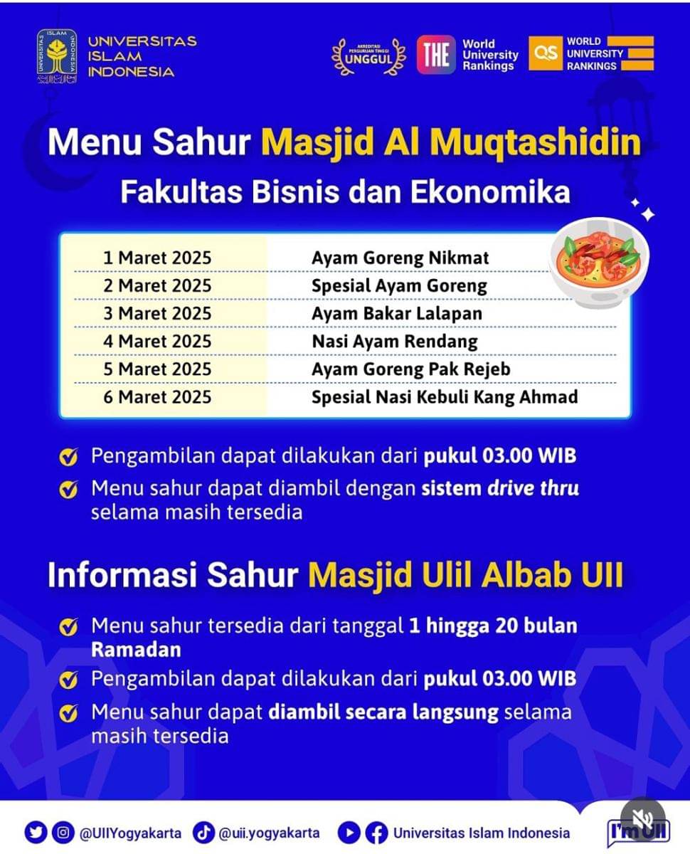 Salah satunya adalah Masjid di Universitas Islam Indonesia (UII) yang rutin membagikan makan sahur dan berbuka. Asyiknya kegiatan ini bisa diikuti secara drive thru, berikut jadwal hingga menu makanan selama Ramadan.