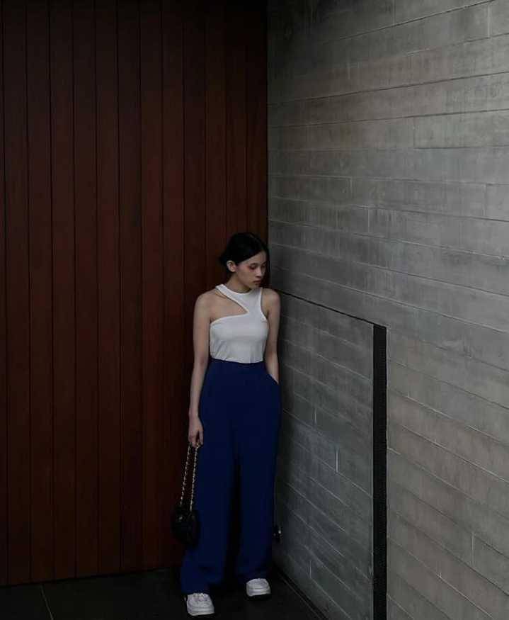 5. Stripe kulot warna navy akan memberi kesan jenjang, loh. Apalagi dengan crisscross crop top dan luaran blazer hitam, dijamin terlihat lebih kurus