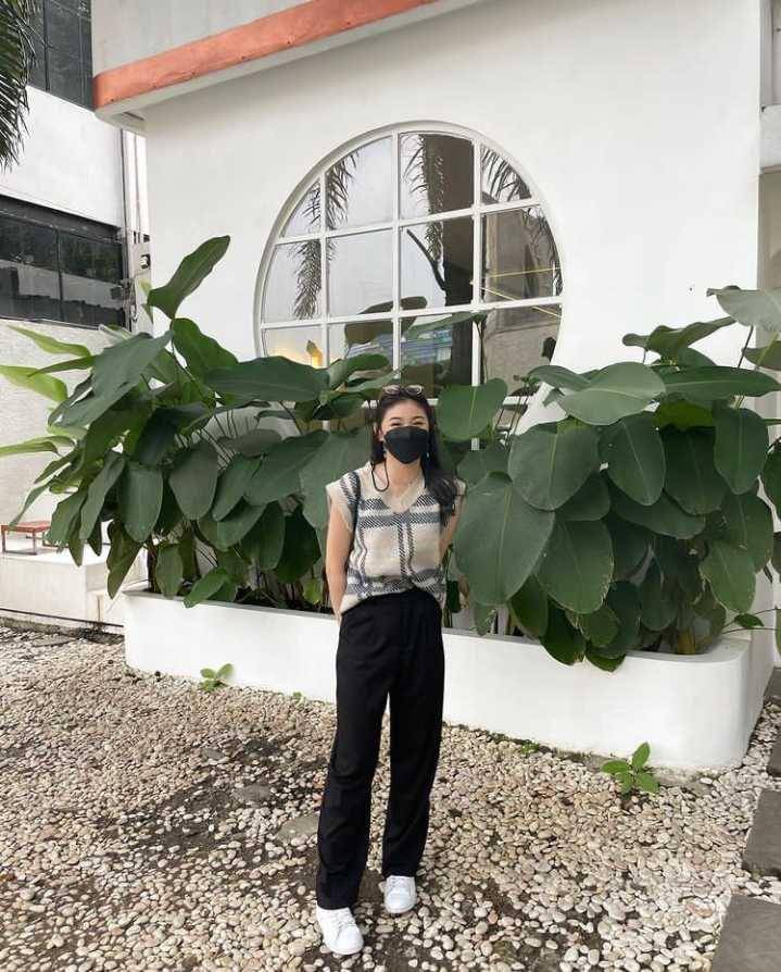 10. Vest rajut sebenarnya cocok dipadukan dengan bawahan apa saja. Tapi kalau mau yang bikin kaki lebih jenjang, pilih straight pants cut off hitam seperti Shani ini