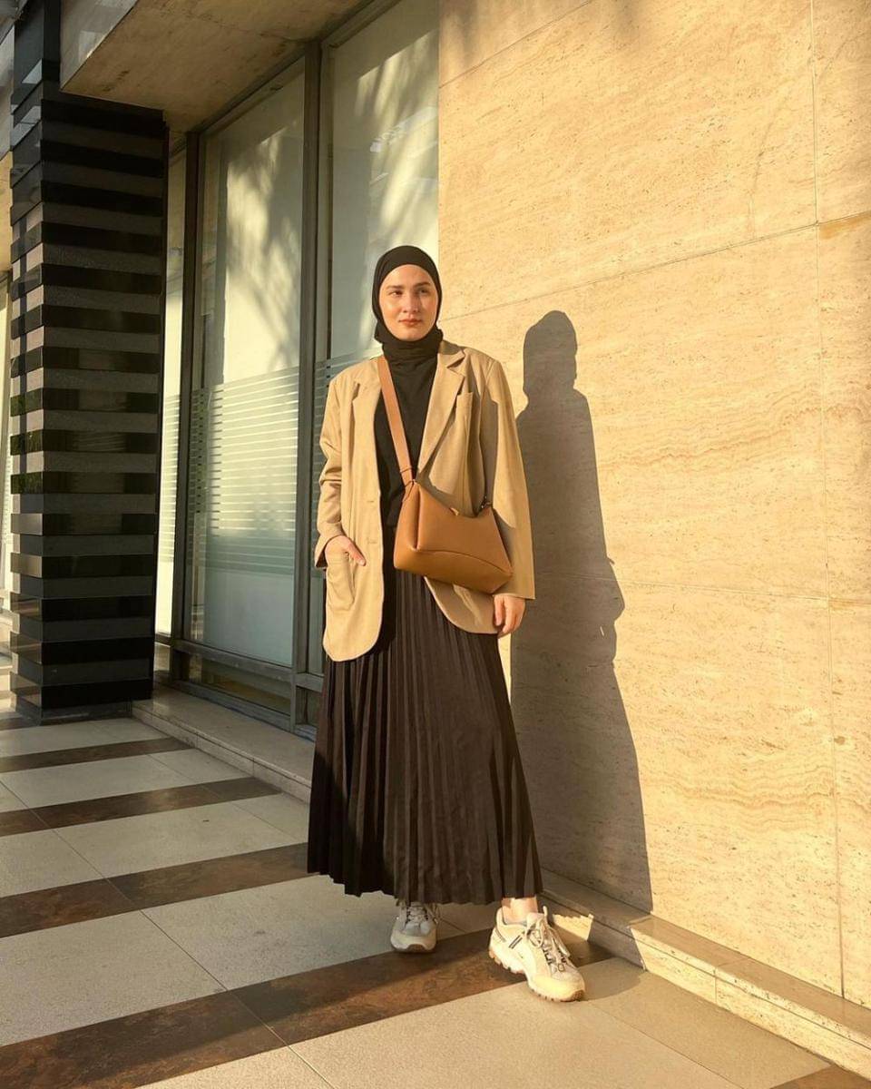 10. Kamu bisa memilih atasan dan rok plisket warna hitam, lalu sempurnakan dengan blazer warna milo untuk menunjang penampilan