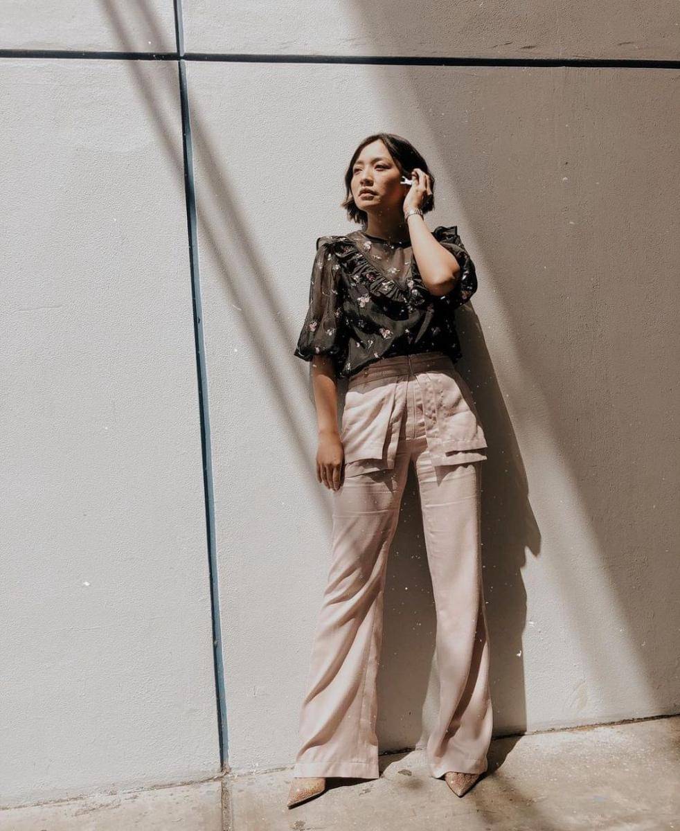 5. Kamu juga bisa gunakan blus hitam bermotif, wide leg pants warna beige, serta stiletto shoes. Kaki akan terlihat tambah jenjang