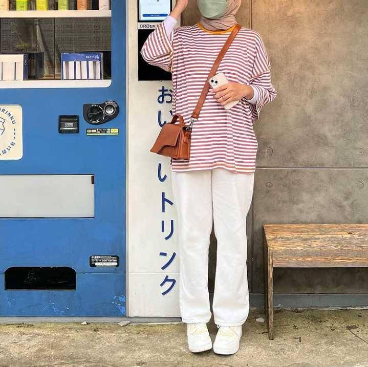 2. Stripe blouse oversize memang terbaik buat dikenakan di segala kondisi. Kalau kamu punya versi warna cerah, mix dengan baggy pants krem atau putih akan sempurna buat kuliah
