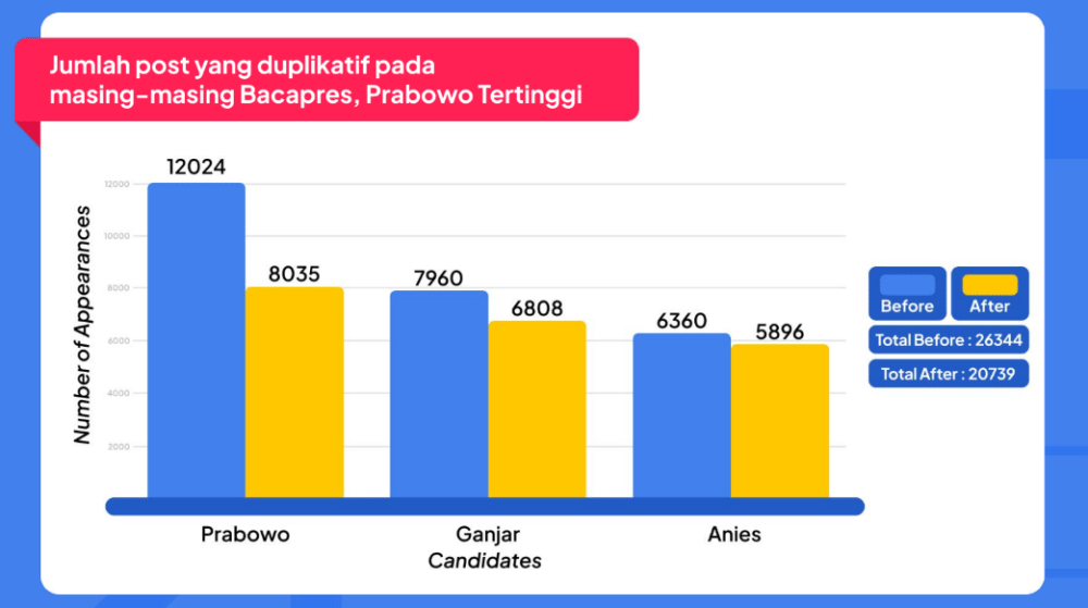 Indikasi paling jelas adalah banyaknya jumlah postingan duplikat dari satu akun pengguna X. "Kami berhasil menghimpun 59.155 posting dengan menggunakan beberapa kata kunci terkait Pemilu 2024, capres, dan partai politik. Setelah menghapus posting yang duplikatif, tersisa 50.503 postingan," ujar Agung Tri Nugraha, Manajer Riset CfDS UGM.