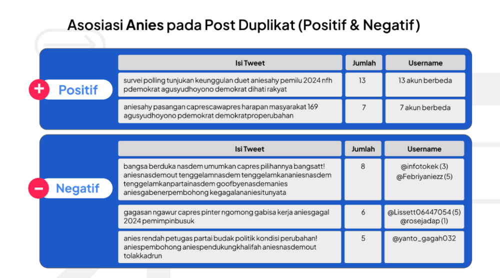 "Setelah penelusuran lebih lanjut, kami menemukan satu akun yang telah mengulang posting tentang Prabowo sebanyak 101 kali. Pola ini berbeda dengan posting positif yang biasanya diduplikasi oleh lebih dari lima akun," tambah Agung.