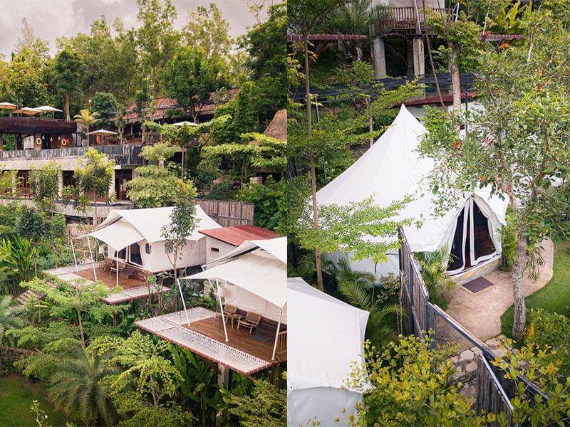Penginapan ini mempunyai banyak glamping mewah di area terbuka seperti hutan. Semuanya tersusun rapi membuatnya seperti perkampungan glamping di area tersembunyi.